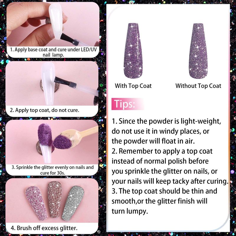 - Easy to Use: Apply base coat (cure) and top coat (not cure), and pour the holographic glitter evenly on the nails. Softly press the nail glitter flakes, no need to apply topcoat, then, put your nails under the UV/LED lamp. It is easy for both beginners and professionals to use the pixie crystals for nails.