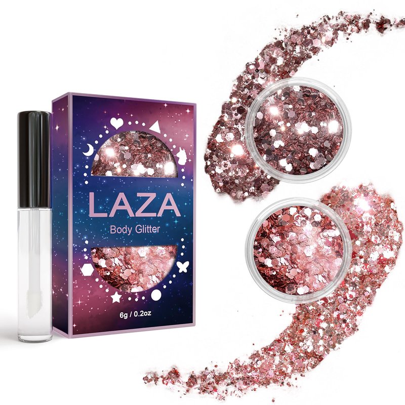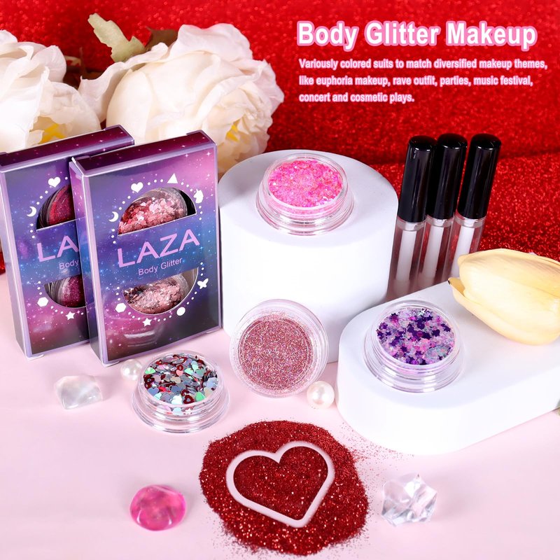 - Laza Body Glitter: This three-in-one glitter makeup kit includes 1 glue and 2 jars of glitter that made of ultra-thin, high reflective and skin-friendly foil, which is shaped into various sizes of glitter and fine powder to meet your diversified demands.
