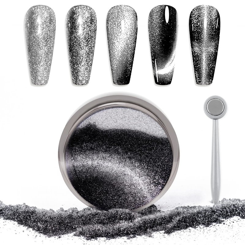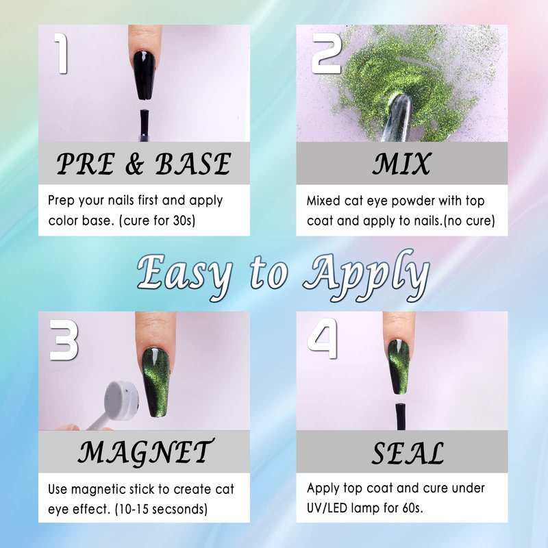 - Use Tips: To create cat eye effect, you need to mix the nail powder with top-coat. After applying on the nails, place the magnetic stick above your nails immediately to achieve your favorite pattern, and then cure for 60s. You can also use the nail powder to create chameleon mirror effect.
