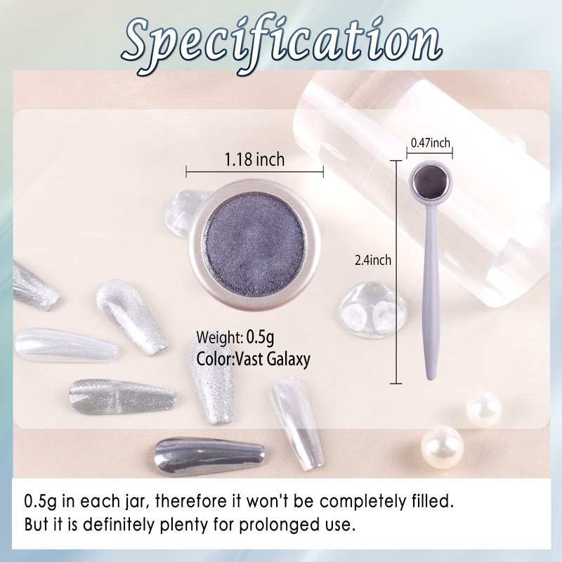 - You will get: 1 jar of cat eye nail powder and a strong magnetic stick. Each jar of powder weighs 0.5g/0.01oz. If there is any problem in use, please feel free to contact us.