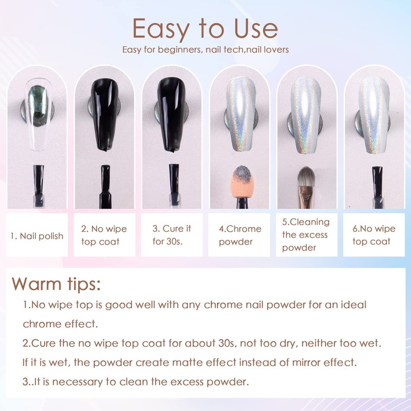 2.Since the chrome nail powder is light-weight, do not use it in windy places, or the powder will float in air.