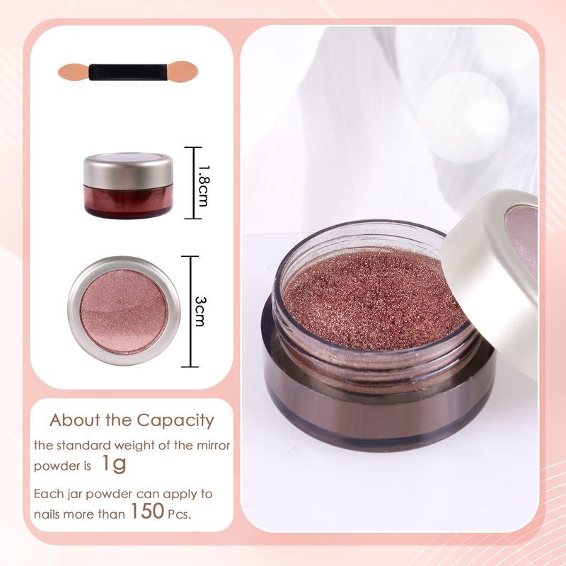 - What You Will Receive: 1 jar of premium chrome powder for nails and a sponge stick (used to apply chrome powder) each package. Each jar contains 1 gram of nail pigment powder for long-time use. And jar was well-sealed to prevent the chrome pigment powder from coming out.