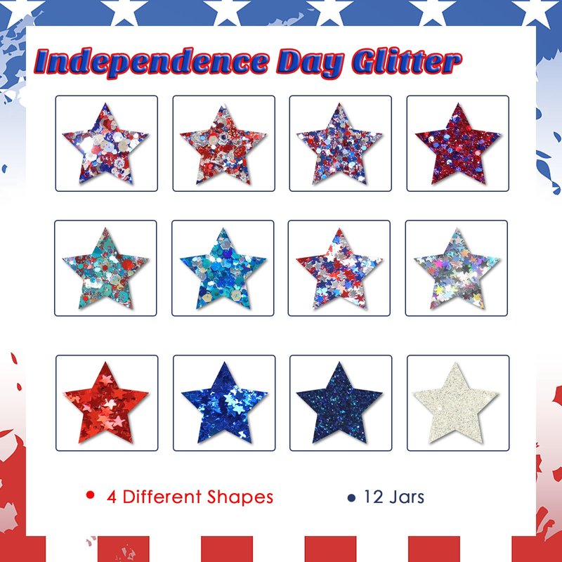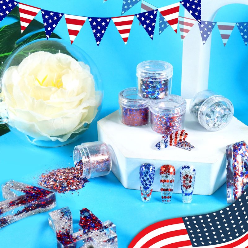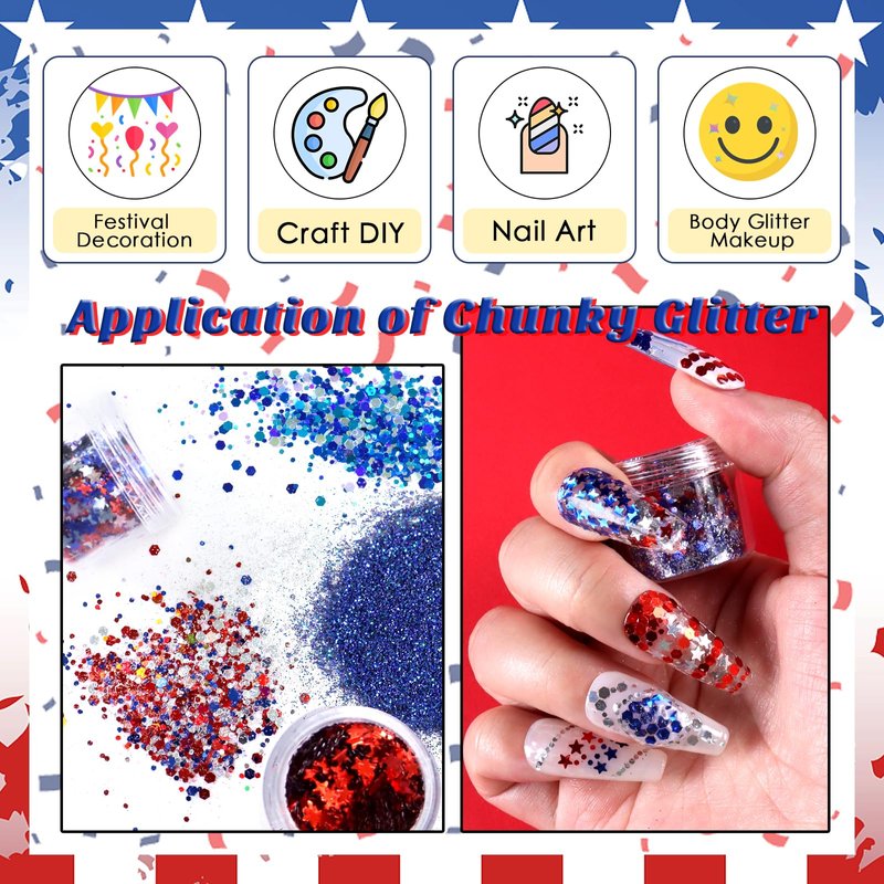 - Various Shapes: There are 4 jars of chunky hexagon sequins, 4 jars of star sequins, 2 jars of medium sized hexagon sequins, and 2 jars of fine glitter. Colors and shape of this 4th of July nail confetti kit is perfect for making American flag nails. You can mix and match theme colors and effects in any combination.
