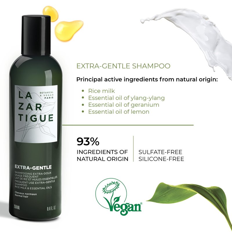 - Organic Ingredients - Lazartigue Extra Gentle Shampoo is 95% natural, vegan, and free of sulfates and silicone. It also contains rice milk, which strengthens weak hair strands to promote thick and healthy hair.