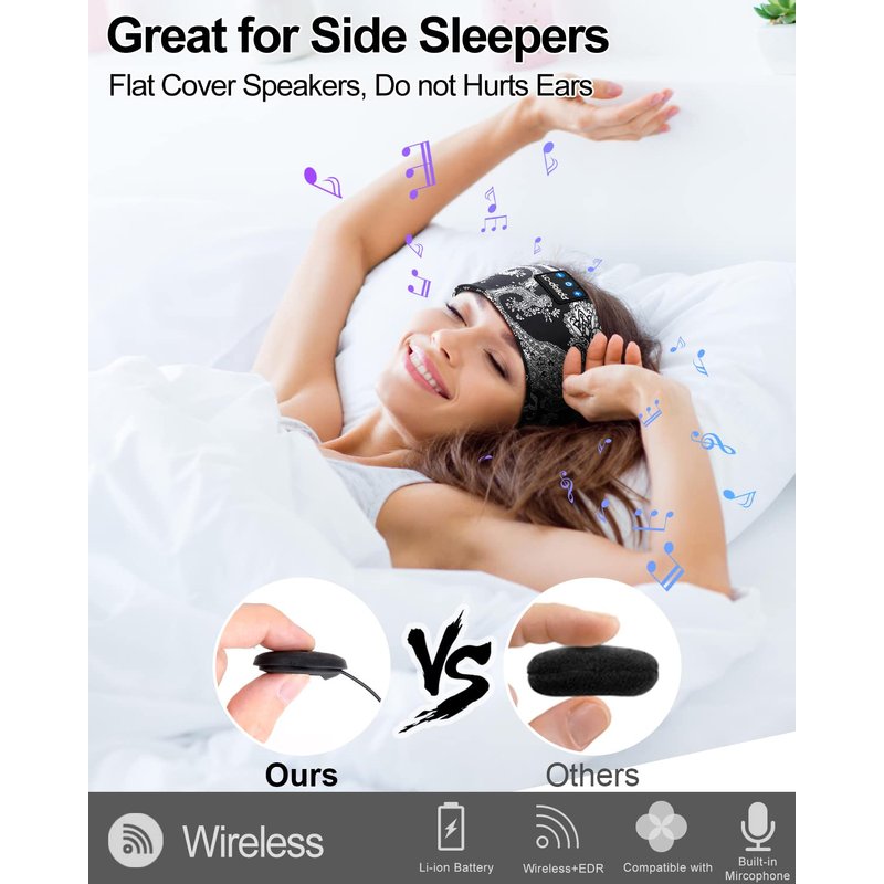 - 【Carefully Selecting fabrics】For ultimate comfort and function of the bluetooth ,we carefully choosed the most suitable high quality textile materials:super soft cotton blended soft fabrics.The sport headphones will make you feel comfortable after sweating exercise.The headphones is the perfect Sleeping Headphones for side sleepers, chose our sleeping bluetooth headphones, fall asleep fast,have a sweet dream