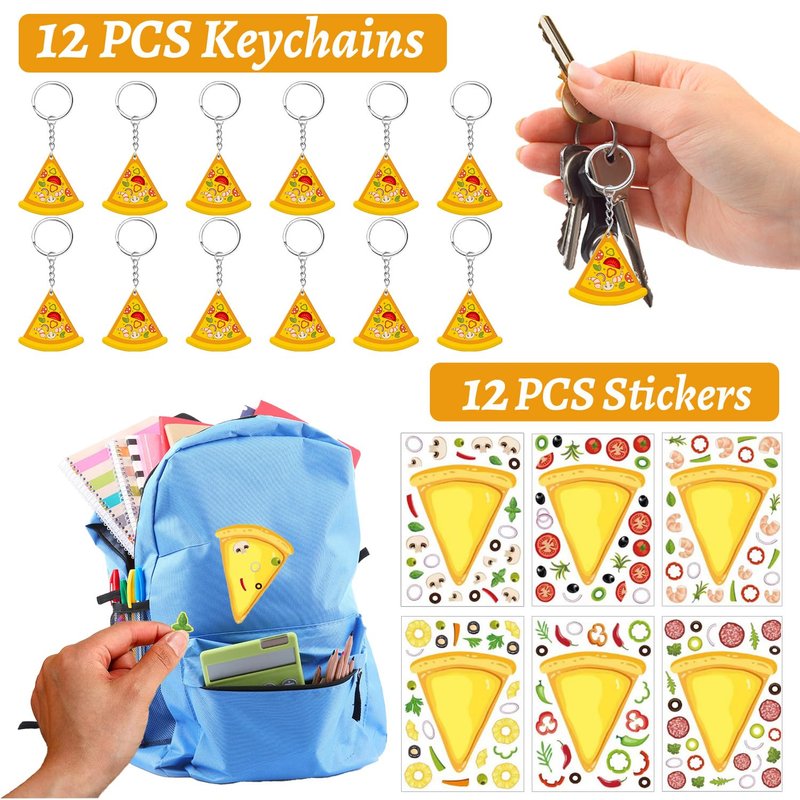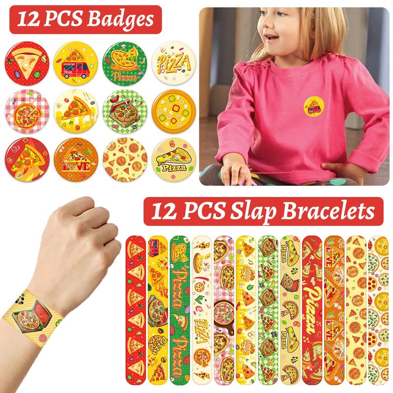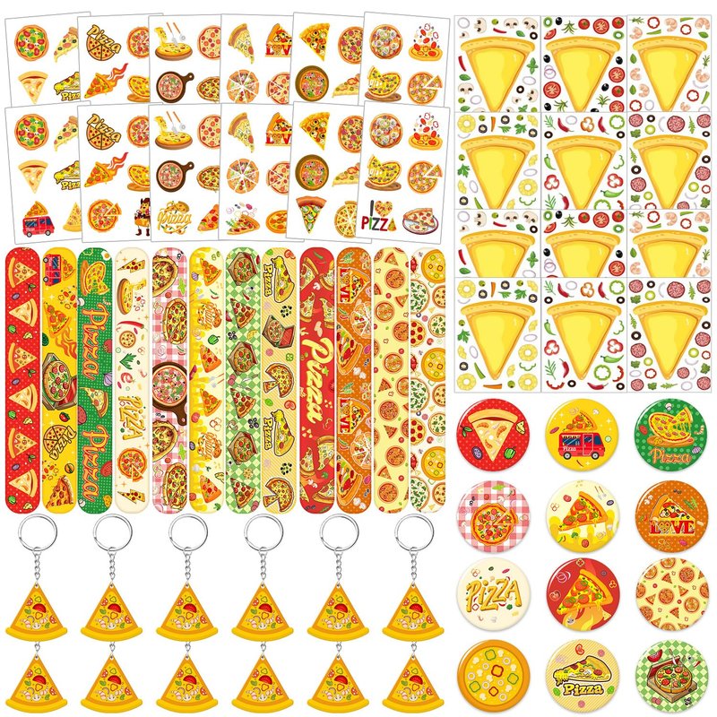 - Package Includes: This pizza themed party favor set comes with 60 pieces, featuring 12 sheets of pizza temporary tattoos, 12 pizza slap bracelets, 12 pizza keychains, 12 pizza badges, and 12 sheets of "Make a Pizza" stickers. This assortment ensures you have everything needed for a fun and festive pizza party