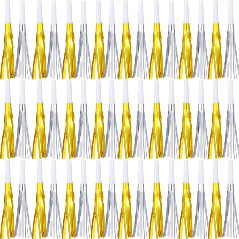 - Fun Party Favors: Set of 48 metallic fringed noise makers in gold white and silver white colors, perfect for celebrations like New Year's Eve, birthdays, and baby showers.