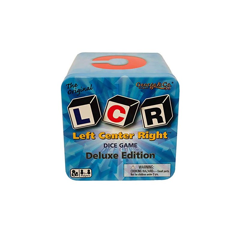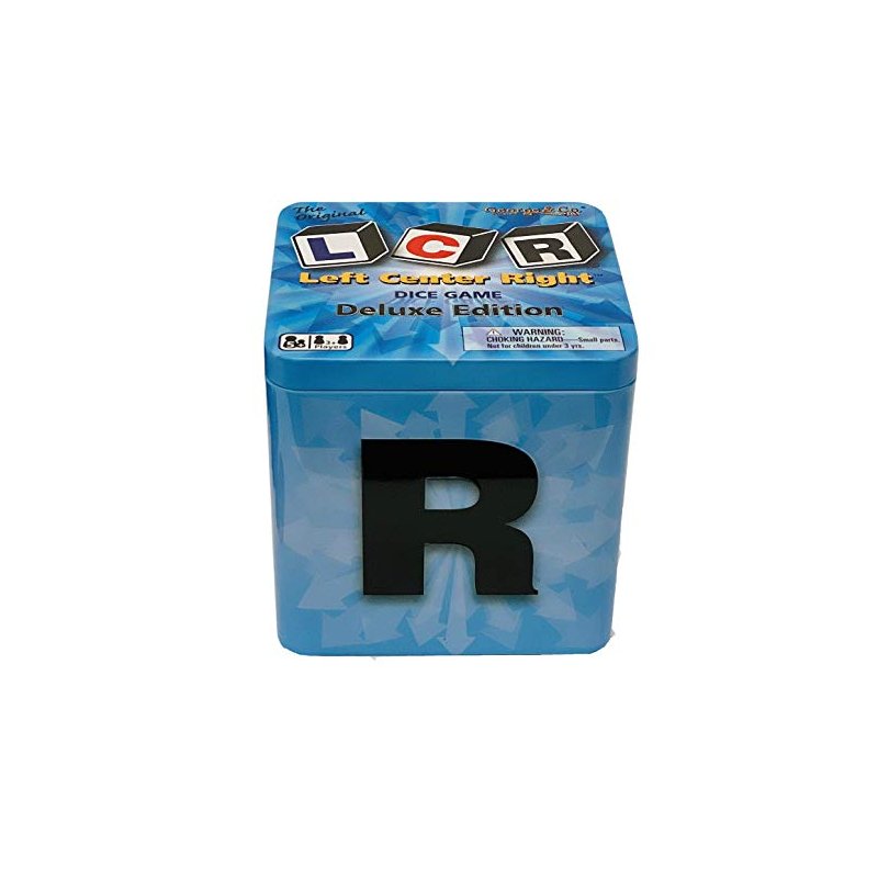 LCR Left Center Right Deluxe Edition game. Our Deluxe Edition game includes three specialty marked deluxe sized LCR Dice, 24 large playing chips, a dice cup, instructions and can easily be stored in the custom designed dice cube tin. Players roll the dice to determine where they pass their chips. The last player with chips is the winner and wins the center pot!