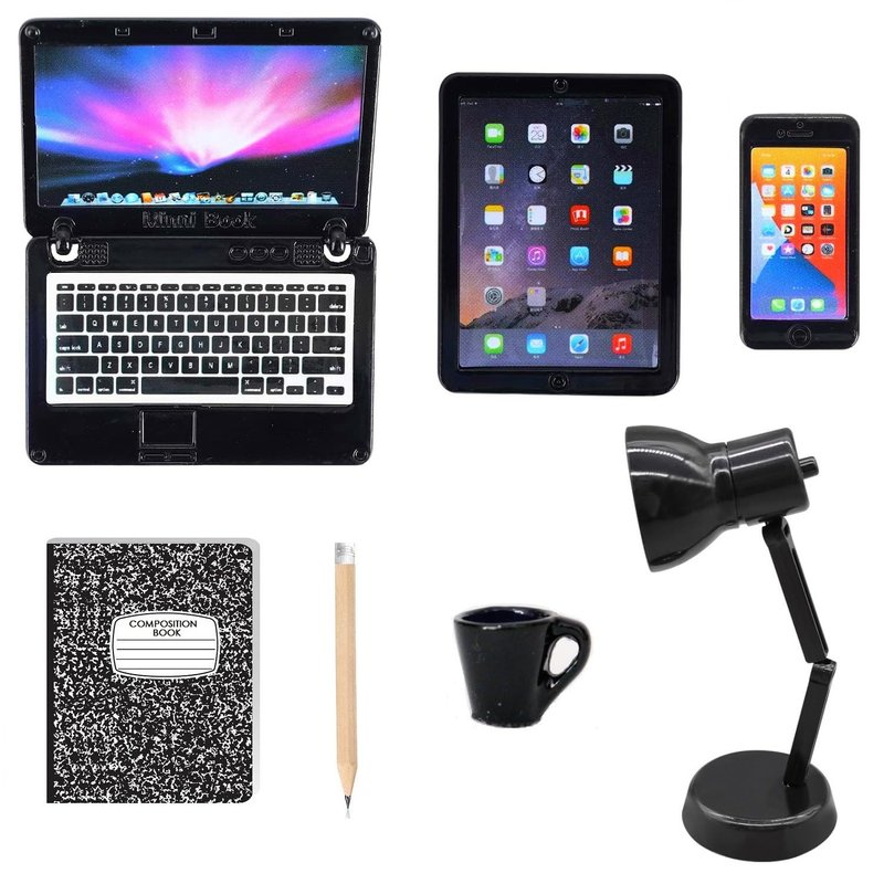 - HIGH QUALITY: The laptop/tablet/phone are made of metal, notebook/pencils/desk lamp/cup are made of plastic;Nice color/non-toxic & safe/light & durable(NOTE: These size are just dollhouse décor not functional)