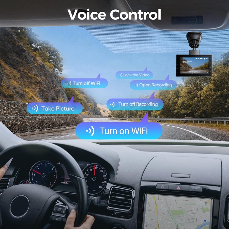 - Voice Control: Dash cam voice control function could help to enhance your focus on driving. User could operate dashcam through instructions. User could make oder by speaking'take picture', 'lock the video', 'turn on WiFi' and etc.