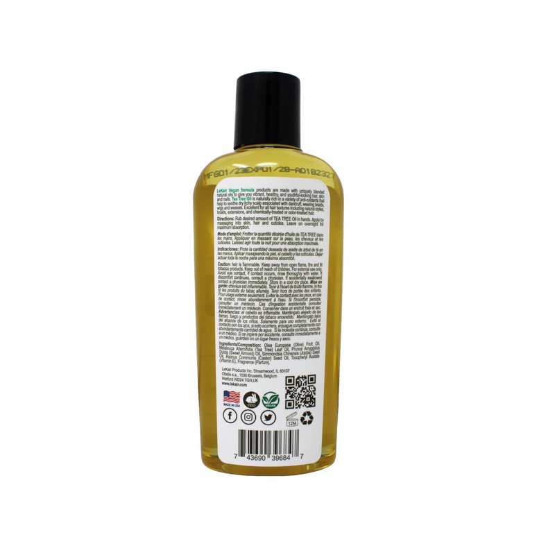 LeKair Vegan formula products are made with uniquely blended natural oils to give you vibrant, healthy, and youthful-looking hair, skin and nails. Tea Tree Oil is naturally rich in a variety of anti-oxidants that help to soothe dry itchy scalp associated with dandruff, wearing braids, wigs and weaves. Excellent for all hair textures including natural styles, braids, extensions, and chemically-treated or color-treated hair. Directions: Rub desired amount of TEA TREE Oil in hands. Apply by massaging into skin, hair and cuticles. Leave on overnight for maximum absorption. Ingredients: Olea Europaea (Olive) Fruit Oil, Melaleuca Alternifolia (Tea Tree) Leaf Oil, Prunus Amygdalus Dulcis (Sweet Almond) Oil, Simmondsia Chinensis (Jojoba) Seed Oil, Ricinus Communis (Castor) Seed Oil, Tocopheryl Acetate (Vitamin E), Fragrance (Parfum).
