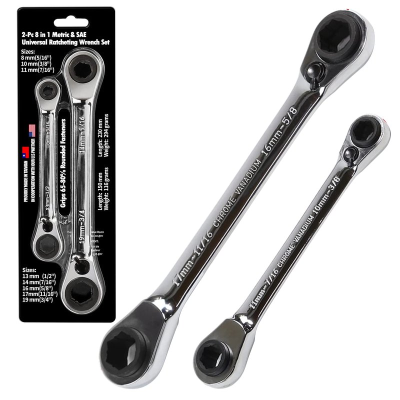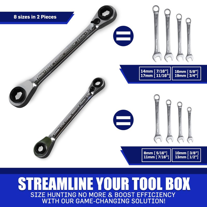 LE LEMATEC 2-pc Ratcheting Wrench Set, 8-in-1 Sizes with 72-Tooth Double Ratchet Gear Wrenches. Efficient DIY and Pro Tasks, Industrial Maintenance, Bicycle, Automotive, and Marine Boat (LE-RWH252)