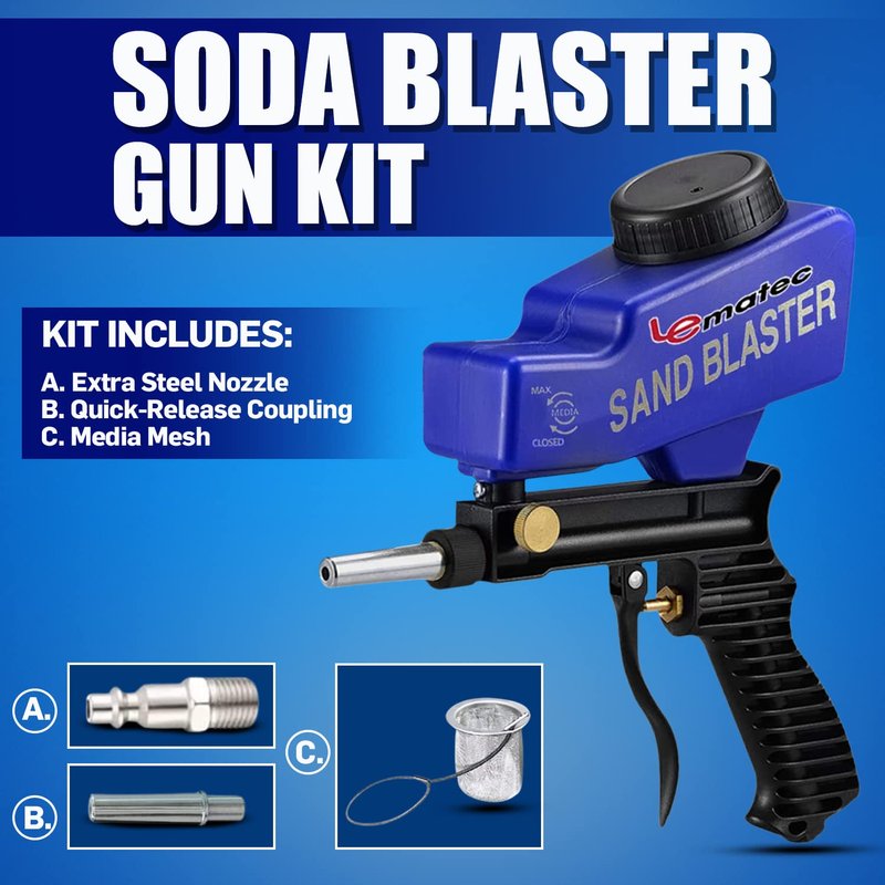 LE LEMATEC Sand Blaster Gun Kit for Paint Removal, Metal Rust Remover & Wood Stripper, Portable Soda Blaster for Air Compressor, Up to 150 PSI Blasting Media for Soda, Aluminum, Sand & Walnut Shells
