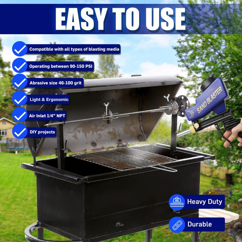 - 𝗟𝗜𝗚𝗛𝗧𝗪𝗘𝗜𝗚𝗛𝗧 𝗔𝗡𝗗 𝗣𝗢𝗥𝗧𝗔𝗕𝗟𝗘 𝗦𝗔𝗡𝗗𝗕𝗟𝗔𝗦𝗧𝗘𝗥: Our hand held sand blaster is durable yet lightweight making it the perfect companion for flawless finishes on-the-go. Whether you're removing rust, cleaning pool tiles, or etching glass, this powerful tool will make the job a breeze no matter where you are.