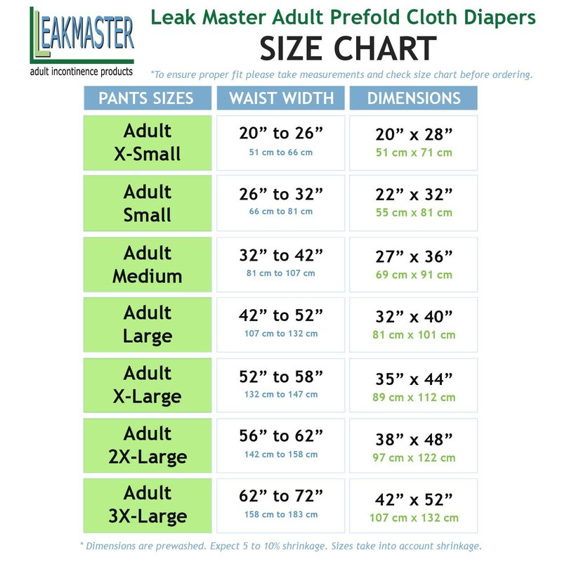 - WATERPROOF PANT ALSO REQUIRED – Adult prefold diapers are folded to fit and require diaper pins and a plastic pant to be worn over them to protect clothing and/or bedding from moisture. Please search for “LeakMaster Plastic Pants” to see a variety of plastic pant types to meet every need.