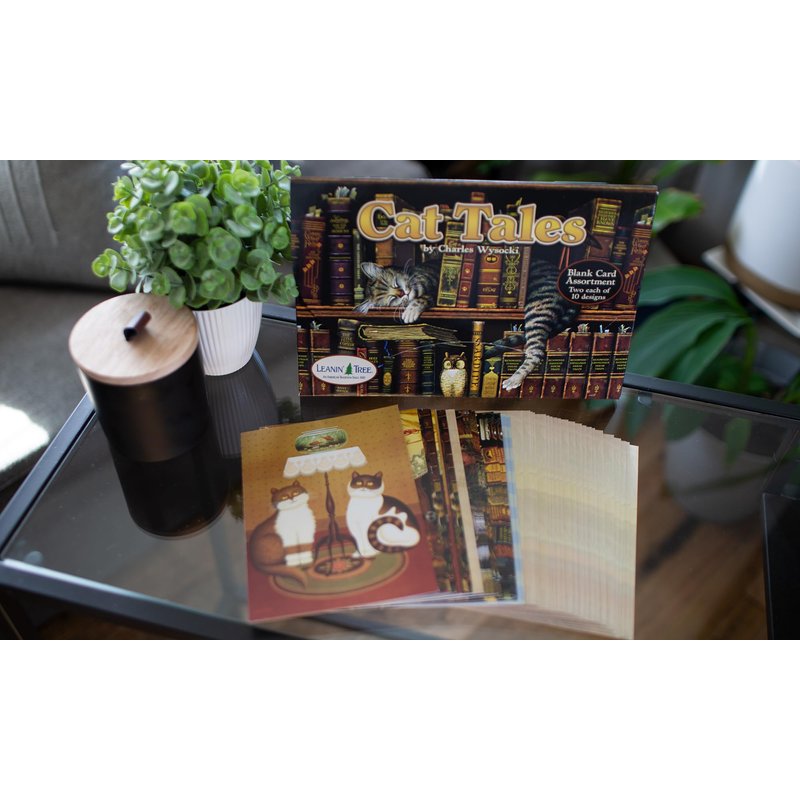 This assortment includes 20 blank cards and 22 envelopes and with cute cat stationary illustrations perfect for cat lovers. These blank note cards are perfect for sending your love with a personal message and can be used for all occasions from sending thank you cards to thinking of you cards. This cute stationery set is designed by the renowned artist Charles Wysocki. These cat-themed blank note cards are filled with playful felines and are perfect for cat lovers young and old. The cards come with 22 colorfully designed envelopes, perfect for sending out your heartfelt messages. Are you a fan of a cute stationery set? You'll love our cat stationary. It's perfect for writing personalized messages on our blank note cards. Our beautiful blank greeting cards and envelopes assortment box set is also great for keeping your cards organized and ready for any occasion. Leanin' Tree is dedicated to sustainable practices. All our cards are printed on recycled paper using soy-based inks. Our blank note cards and envelopes can be used for sending thank you cards, get well cards, thinking of you cards and more and are perfect for expressing your gratitude and love. So why wait? Get the Leanin' Tree Greeting Card Assortment Box today and start spreading joy with our beautifully designed blank note cards. Whether you're searching for the cat lovers in your life or for yourself, this assortment of blank cards and envelopes is versatile. Made in the USA, our cards offer quality and creativity that's unmatched. Celebrate every occasion with Leanin' Tree. Because every moment is worth remembering.