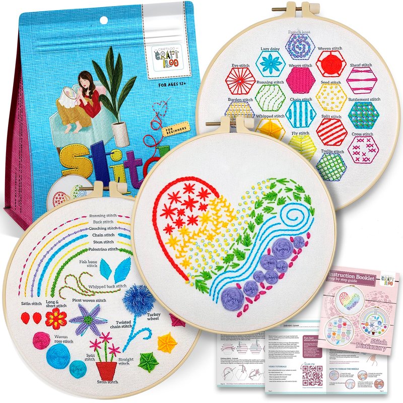 - [EVERYTHING IS INCLUDED] Embroidery kit for beginners includes: 3 Designs Pre-Printed patterns on Embroidery Fabrics, 1 HQ Plastic Hoop 7.9", Plenty of Floss, 10 Embroidery needles ,2 needle threader ,1 Seam ripper, Detailed Instruction Booklet