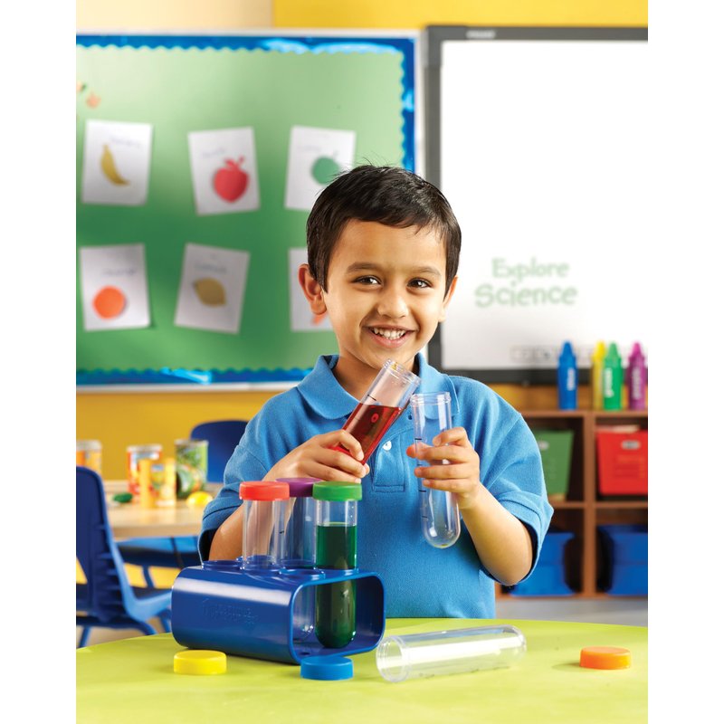 - Includes 6 chunky plastic test tubes, 6 colored lids, sturdy rack, and activity guide