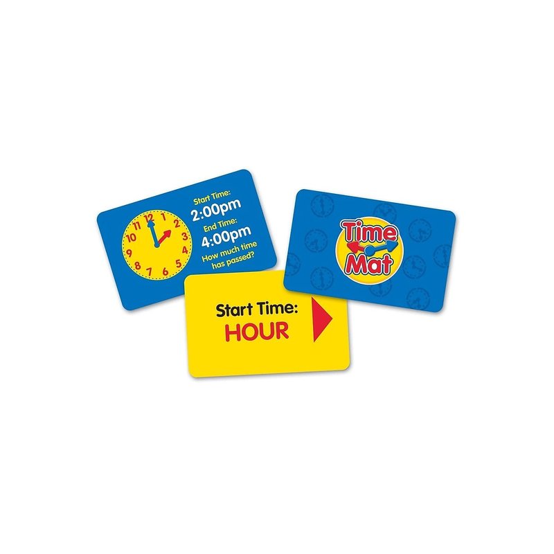 - Set includes vinyl clock mat, removable, color-coded clock hands, hour and minute dice, activity cards, and activity guide
