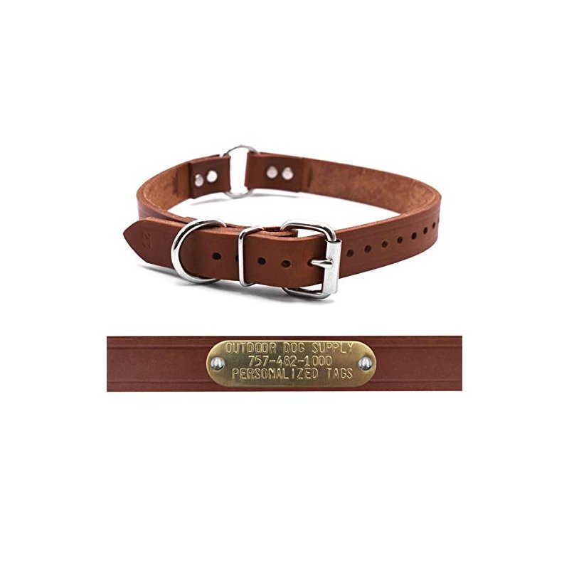 Leather Dog Collar Strap with Custom Brass Name Plate (D Ring & Center Ring, 1" W 19" L)