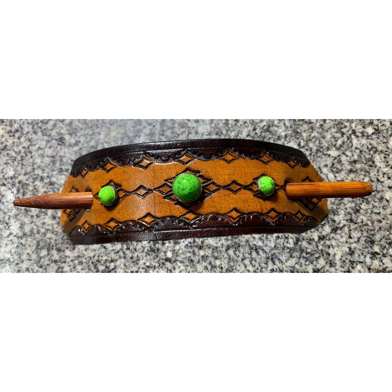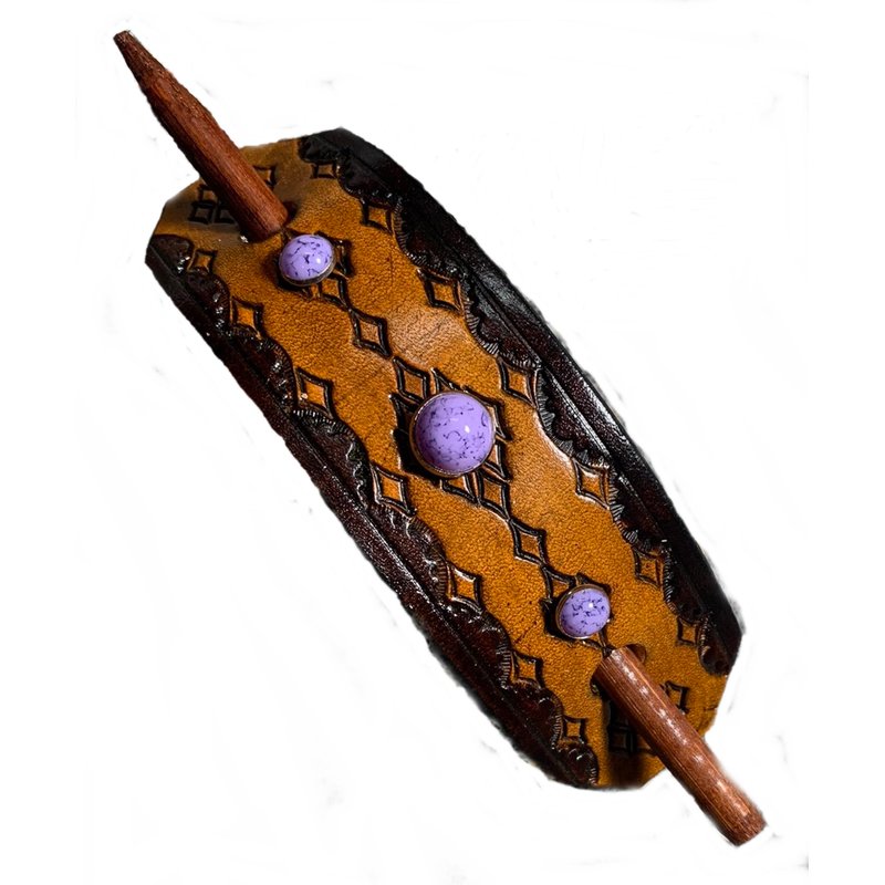 LEATHER HAIR BARRETTE…. CLIPPED CORNER PONYTAIL HOLDER…. HANDTOOLED HAIR CLIP…. PURPLE OR GREEN STONE ACCENT…BT 2320