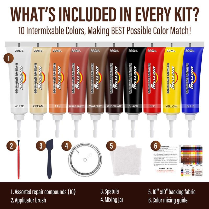 - MCTRHG Leather Couch Repair Kit - All tools needed for repairs are included in one kit. And the instruction is detailed but easy to follow, anyone can easily match the desired color and fix leather and vinyl pretty well.
