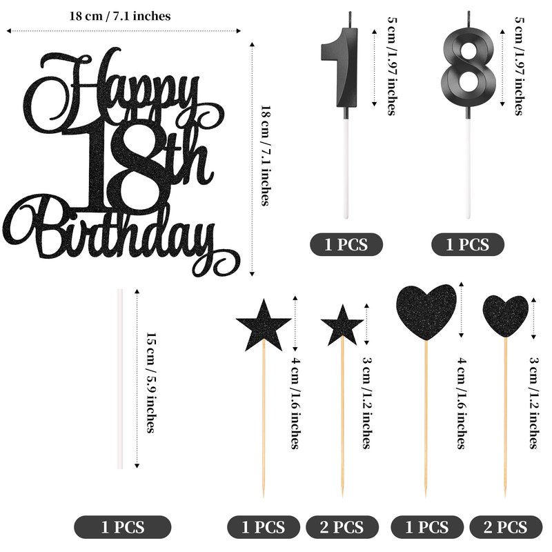 - Package content: you will receive 1 piece happy 18th birthday topper, 3 pieces star cake toppers, 3 pieces heart cake toppers and 2 pieces numeral candles, it's a great addition to the 18th birthday party and anniversary party