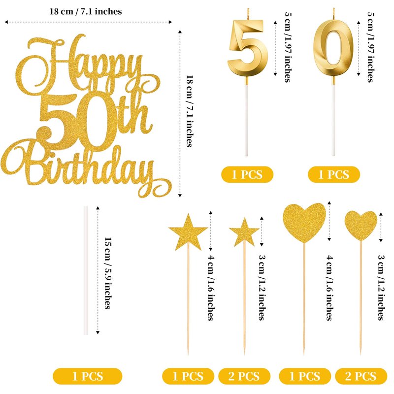 - Package content: you will receive 1 piece happy 50th birthday topper, 3 pieces star cake toppers, 3 pieces heart cake toppers and 2 pieces numeral candles, it's a great addition to the 50th birthday party and anniversary party