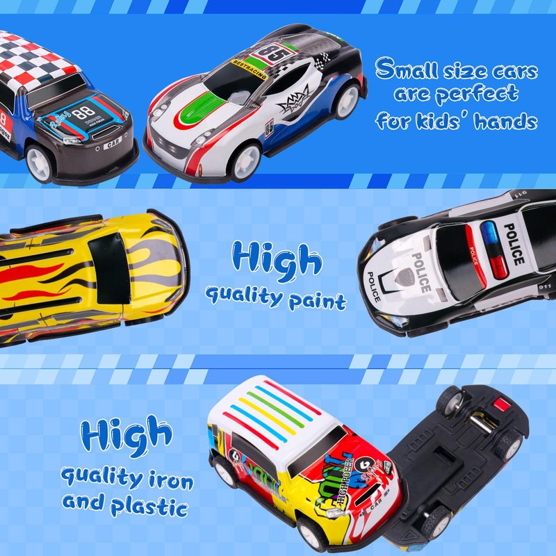 - SAFE FOR KIDS, HIGH QUALITY, MINI SIZE - LENGTH ABOUT 2.7 INCHES --- These toy cars are made of high-quality metal and plastic, no sharp edges or corners, will not hurt your child, safe material with bright color. Smooth wheels allow the car to run smoothly. The length of the toddler cars are about 2.7 inches, perfect for children’s small hands to grasp.