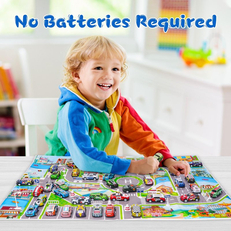 - PULL BACK & GO TOY CARS, NO BATTERIES REQUIRED --- These pull back cars are powered by mechanism, just pull them back and release, these toy cars will move smoothly on floor, table top. No batteries needed, easy and fun for all the toddlers, boys, girls. Perfect for 3 4 5 6 year old party favors.