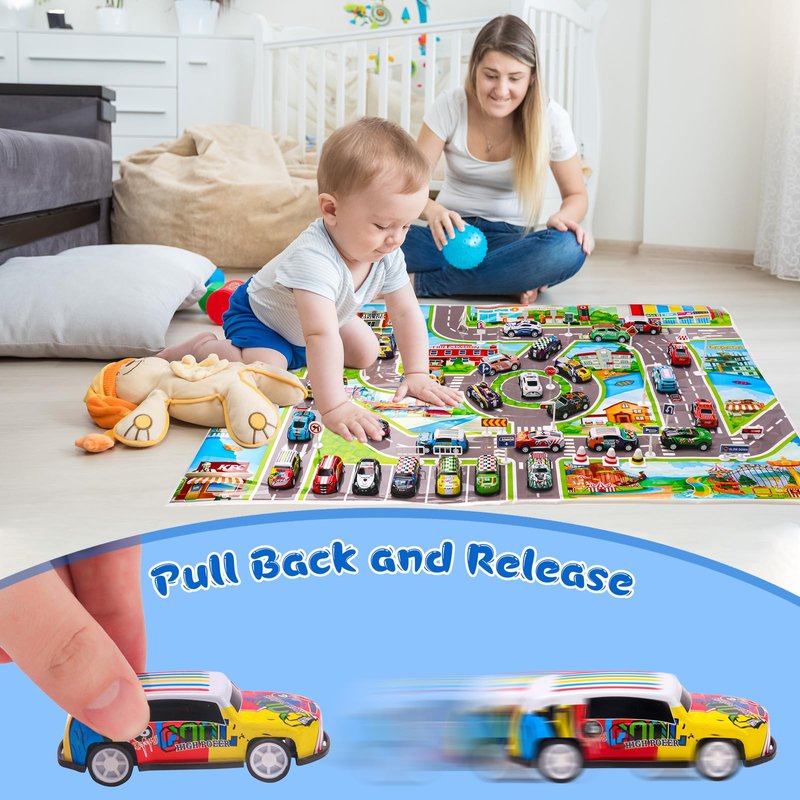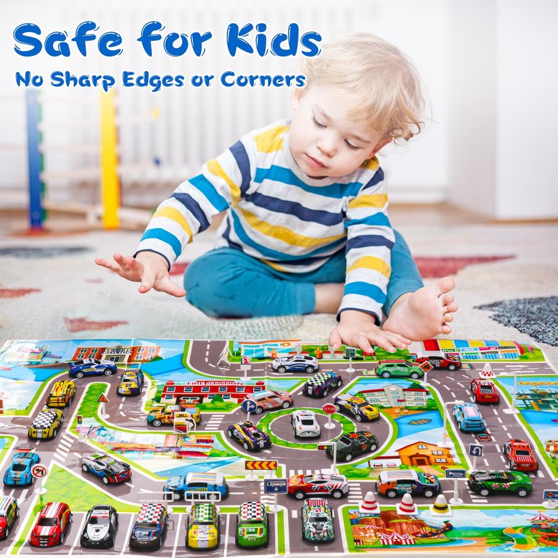Interesting Toy Cars Set will Get Your Kids Away From Couch, Tablet Screens. What Included in the Parcel: 50Pcs Pull Back Cars 1Pcs Map 1Pcs Storage Box Pull Back & Go Toy Cars, No Batteries Needed Just pull them back and release, these toy cars will move smoothly. Perfect for 3 4 5 6 year old boys girls toddlers. Learning While Playing Improve your little ones’ color recognition, hand-eye coordination, motor skills. Ideal gifts for Christmas. Rich Variety of Shapes Toy Cars 50 pieces toy cars with bright color and different shapes will bring your little ones a big surprise and endless fun. Party favor toys for kids. Mini Size Cars, Suit for Your Baby’s Hands The size of these toy cars’ size is about 2.7 Inches, perfect for children’s small hands to grasp. Safe Material for Kids These toy cars are made of high-quality metal and plastic, no sharp edges or corners, will not hurt your child. Safe enough for Kids. Christmas Gift Choice Great as Christmas goodie bag stuffers for 3 4 5 6 year old boy girls toddlers, birthday gift ideas. Perfect as Christmas gifts, kids birthday gifts, back to school gifts, classroom student prizes, educational toys, Thanksgiving day gifts, Easter fillers.