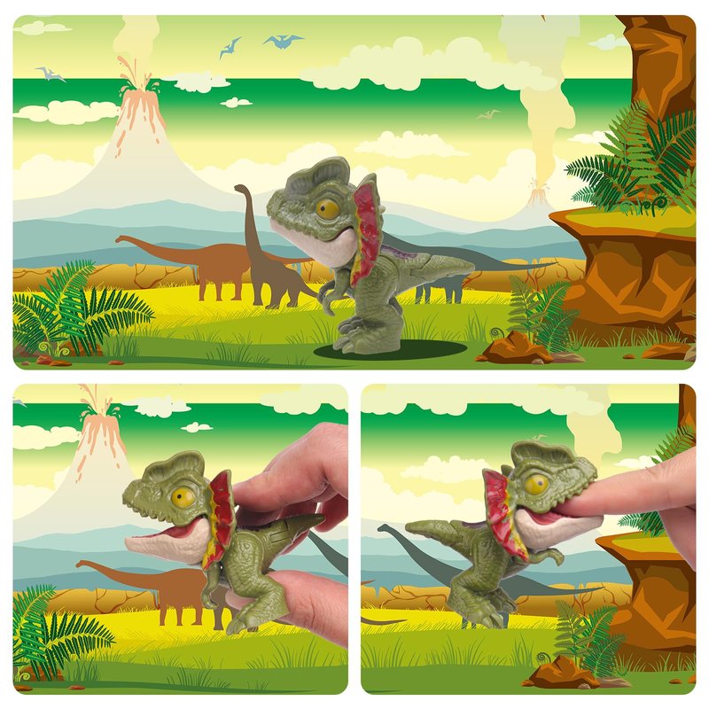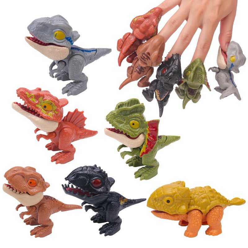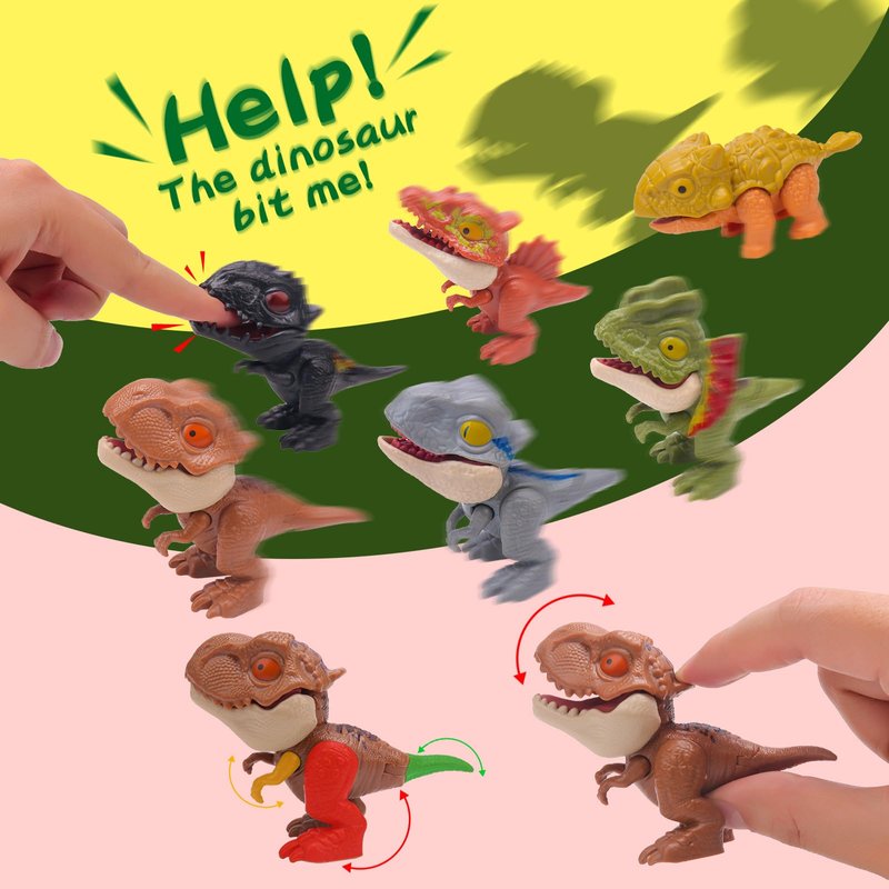 Package Include: 6pcs biting finger dinosaur toys, 1* Tyrannosaurus Rex, 1* Tyrannus, 1* Double Crowned Dragon, 1* Ankylosaurus,1* Spinosaurus and 1* Raptor.