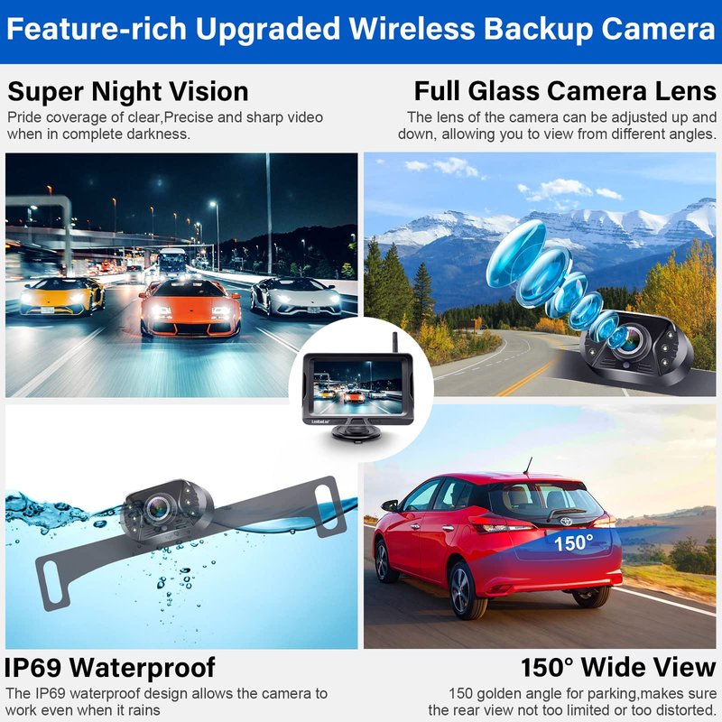 - 【IP69K waterproof & High-Temperature Resistant】Wireless backup camera for car adopts the latest sealing technology, with IP69 waterproof function, can withstand severe weather, but also can withstand extreme temperatures of -22 ° F to 176 ° F. Ensuring normal operation in both hot and cold weather and making driving more convenient and safe.