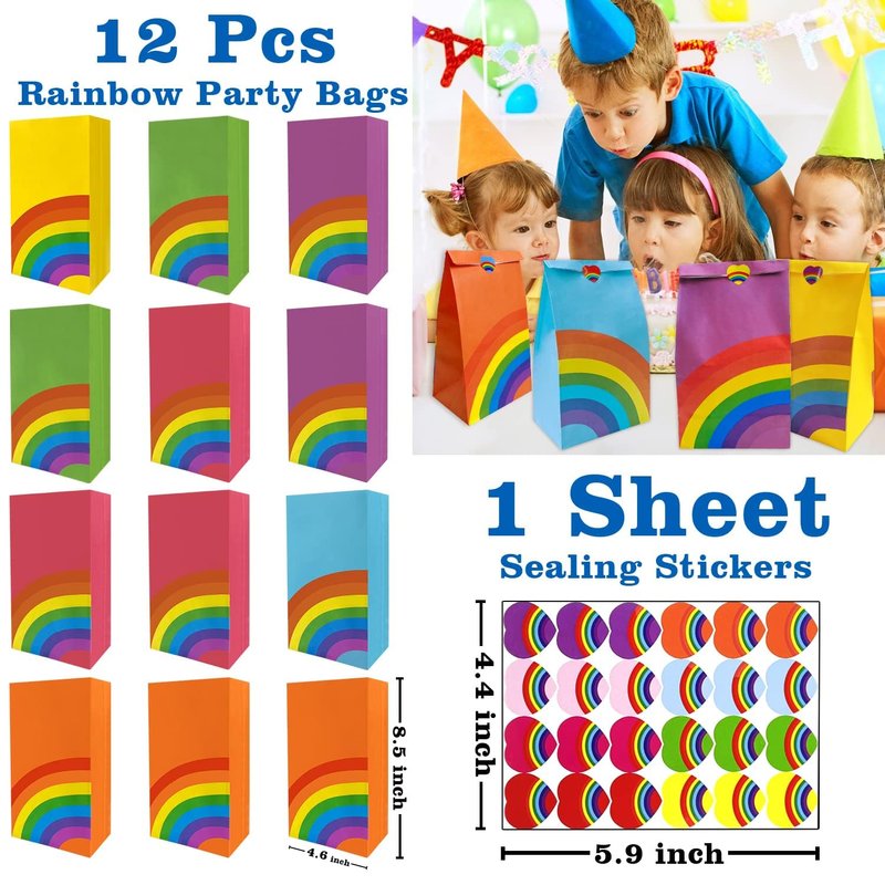 - 【Variety of Rainbow Party Favors】Totally 156 pcs Leesgel rainbow party favors, includes: 12 x Rainbow Brooch, 12 x Rainbow Bracelet, 12 x Rainbow Tattoos, 12 x Rainbow Whistle, 12 x Rainbow Keychain, 12 x Rainbow Goodie Bags, 60 x Rainbow Stickers, 24 x Rainbow Lables for Sealing.