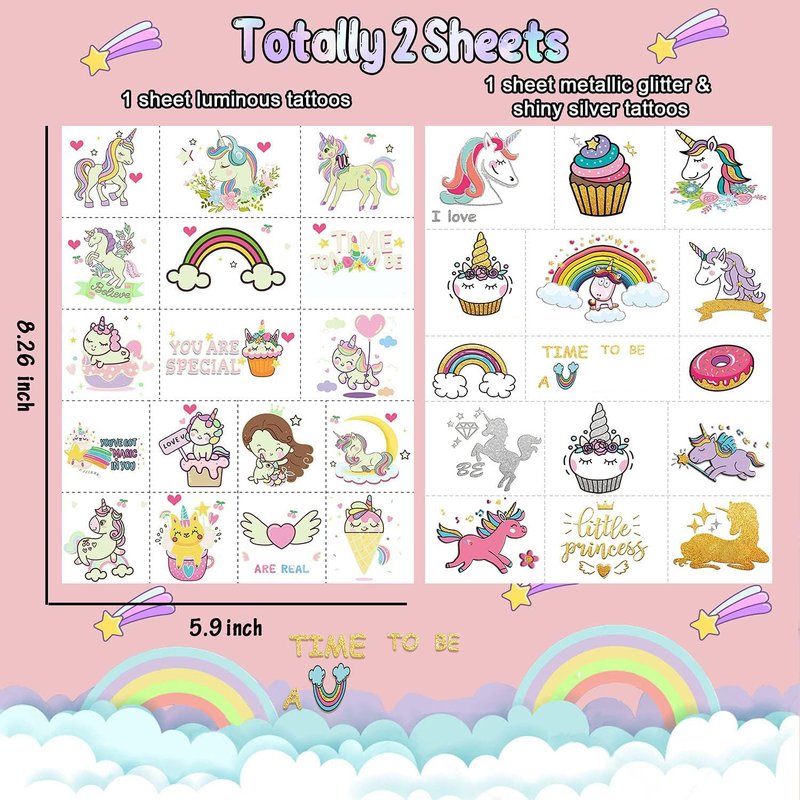 Leesgel (Glow + Metallic Glitter) Temporary Tattoos for Kids Girls Boys, Unicorn Birthday Decorations Party Favors Party Supplies, Kids Temporary Tattoos Toy Tattoos stickers