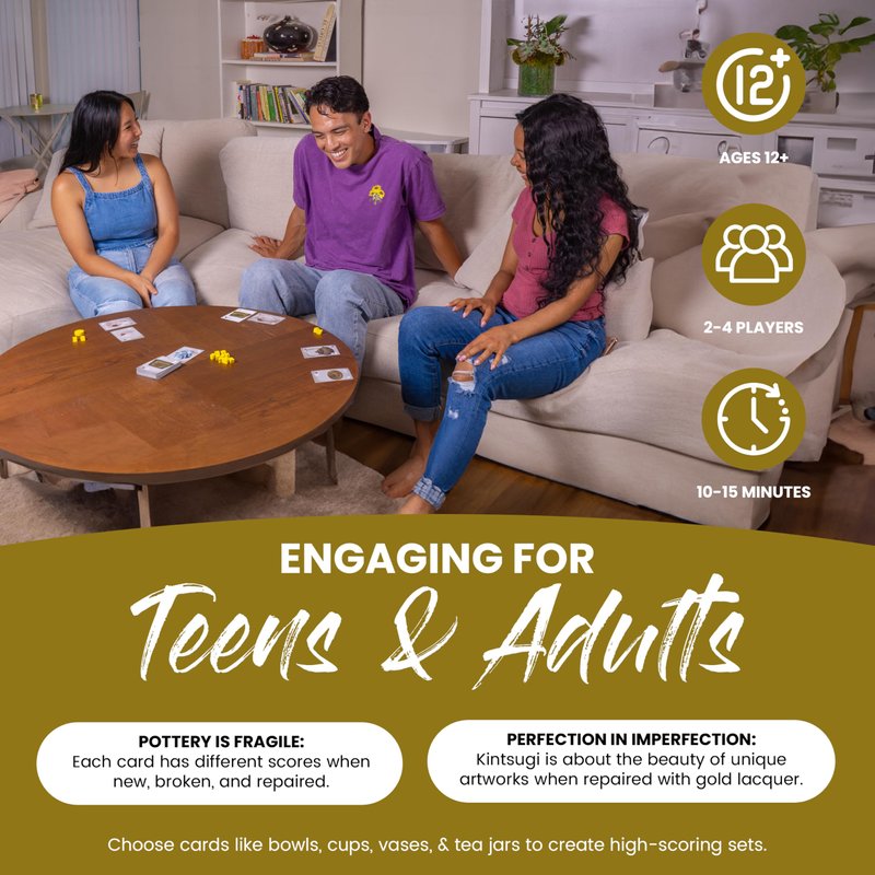 - Inspired by Kintsugi Art – Experience the beauty of transformation with this card game inspired by Kintsugi, the Japanese art of mending with gold. Perfect for players of all ages, it celebrates creativity and resilience in a fun way!