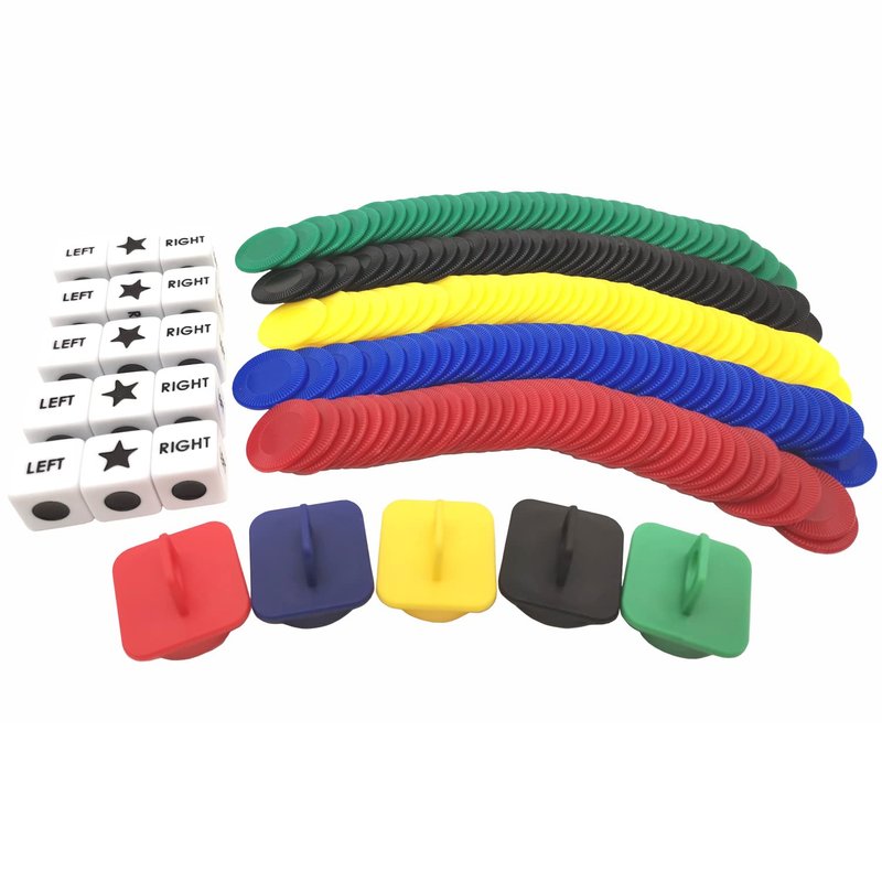 Left Right Center Dice Game Prime Set Bundle with 3 Dices + 30 Chips. Round Tube Storage is Very Convenient for Travel. Easy to Store, Carry Around. (5 Pack)