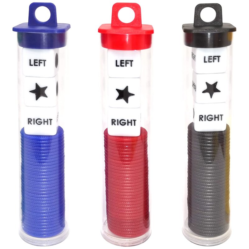 Left Right Center Dice Game Prime Set Bundle with 3 Dices + 36 Chips . Round Tube Storage is Very Convenient for Travel. Easy to Store, Carry Around.