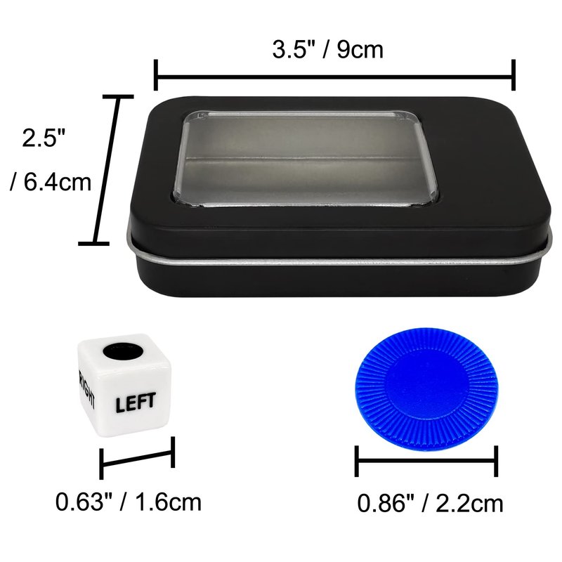 Cube dice are marked with "Left", "Right", "★"(Center=Put your chips in the center pot), and "●"(Dot=Good luck, you can keep your chips).
