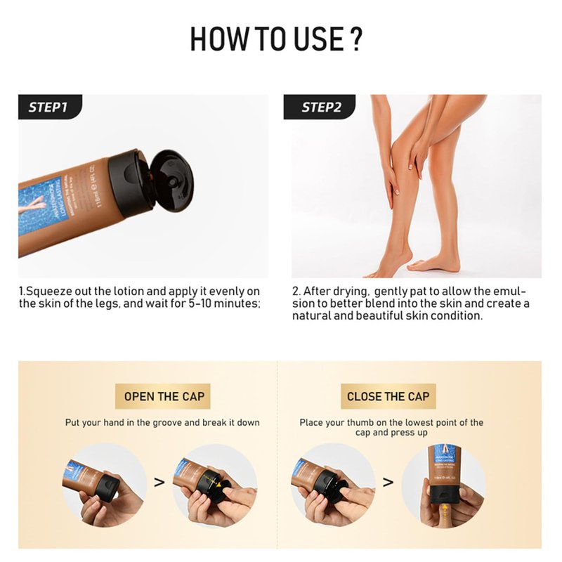 - 💃【How to Use】First, squeeze out the lotion and apply it evenly on the skin of the legs, and wait for 5-10 minutes. Then, after drying. gently pat to allow the emulsion to better blend into the skin and create a beautiful skin condition.