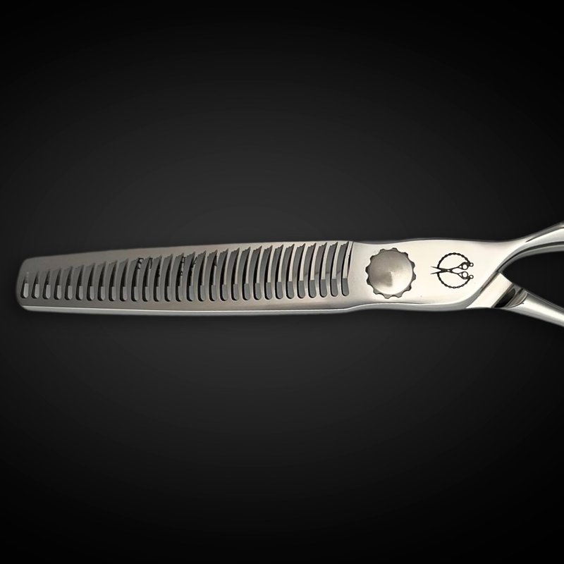 The Legacy ATS-314 Professional Hair Thinning Shears, expertly crafted for precision and performance. Made from premium ATS-314 Japanese steel, these shears are built to offer unparalleled durability and sharpness, making them a perfect choice for professional stylists who demand excellence in every cut. The 40-tooth thinning blade is designed to provide flawless blending, softening, and texturizing, creating a seamless transition between lengths without sacrificing volume.