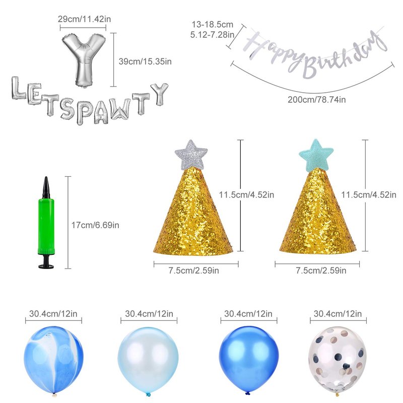Color: Golden, silver Material: Aluminum foil, latex, cloth, paper Single Size: Latex balloon: Diameter 12in, 10pcs Foil balloon: L*W: 39*29cm(15.35*11.42in), 9pcs Happy birthday banner: String length 2m(6.56ft), one letter height 13-18.5cm(5.12-7.28in), 1 piece Triangle flag banner: String length 3m(9.84ft), one flag: L*W: 18*13cm(7.09*5.12in), 1 piece Cone hat: Diameter 7.5cm(2.95in), height 11.5cm(4.53in), 2pcs Package Includes: 23 x Party decoration 1 x Air pump Note: - Please refer to the measurement. Tiny measuring error is allowable in normal range. - There might be a little color difference due to the monitor, camera or other factors, please refer to the physical item. Package Including 23 x Party decoration 1 x Air pump