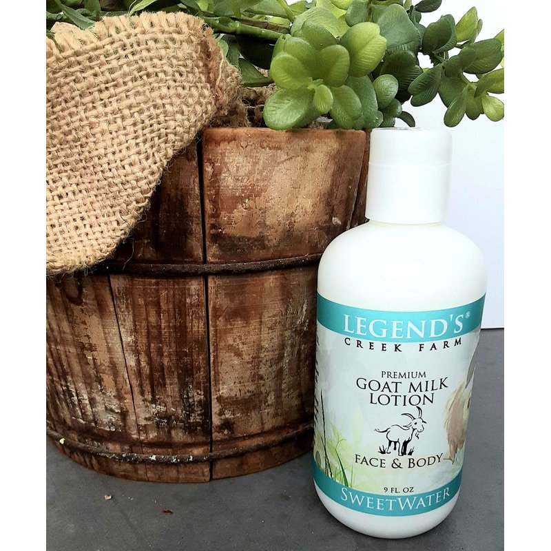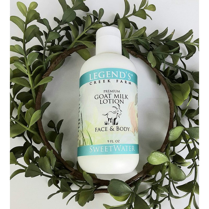 Legend's Creek Farm Lotion, Premium Goat Milk Lotion, Body, Hand & Face, Deeply Moisturizing, Shea Butter, Sunflower Oil & Aloe, No Harsh Chemicals, Handmade in USA, 9 Oz (Sweetwater L.)