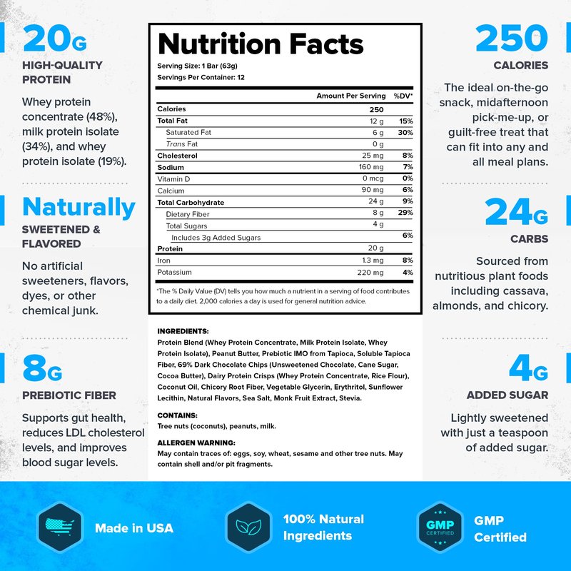 Experience the ease of digestion that our healthy protein snacks offer. Packed with 9 grams of prebiotic fiber, our low calorie protein bars support gut health, providing sustained energy without bloating or cramping.