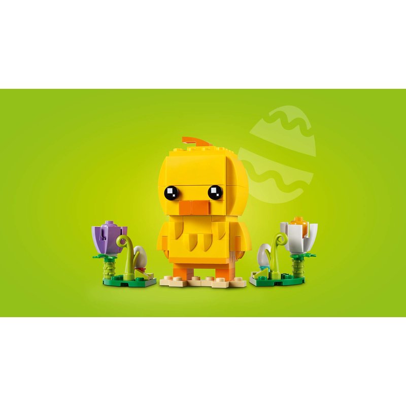 - Buildable LEGO BrickHeadz interpretation of an Easter Chick with BrickHeadz eyes stands in a scene featuring colorful Easter flowers and leaves, and 2 eggs