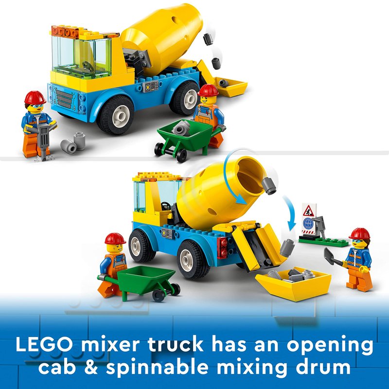 - The construction vehicle toy features an opening driver's cab and a spinning mixing drum, plus 2 minifigures for hours of role-playing play