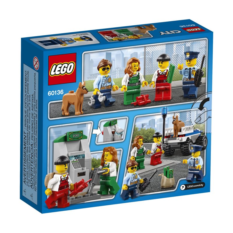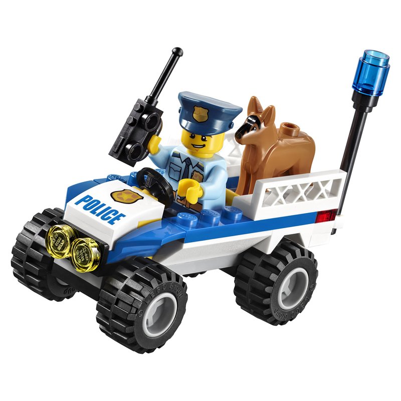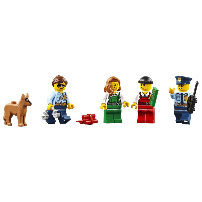- Includes four minifigures: two police officers and two crooks, plus a police dog figure