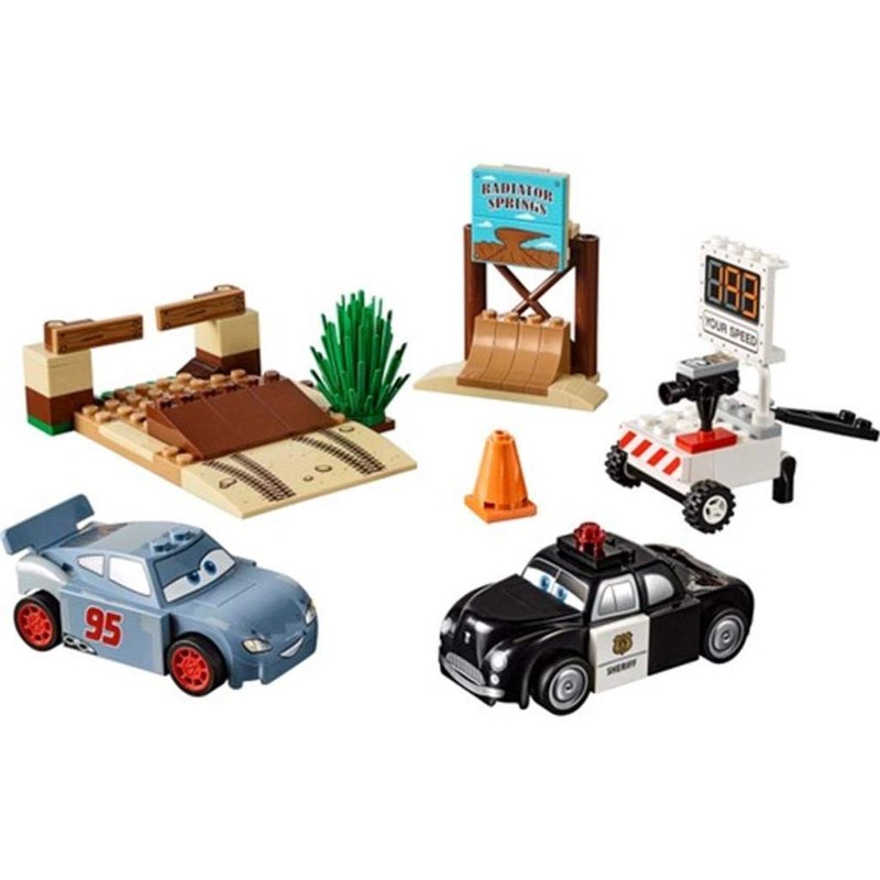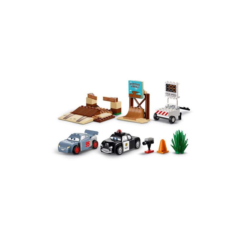 - Includes Lightning McQueen in his training outfit decoration and Sheriff characters from Disney Pixar Cars 3, accessory elements include a ramp, cone and a shrub