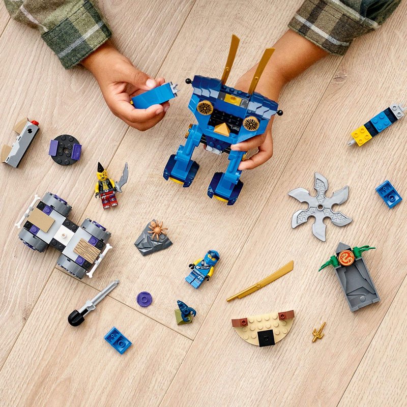- LEGO NINJAGO Jay’s Electro Mech (71740) helps kids learn how to build before they enjoy fun battles with a posable mech toy and ninja car
