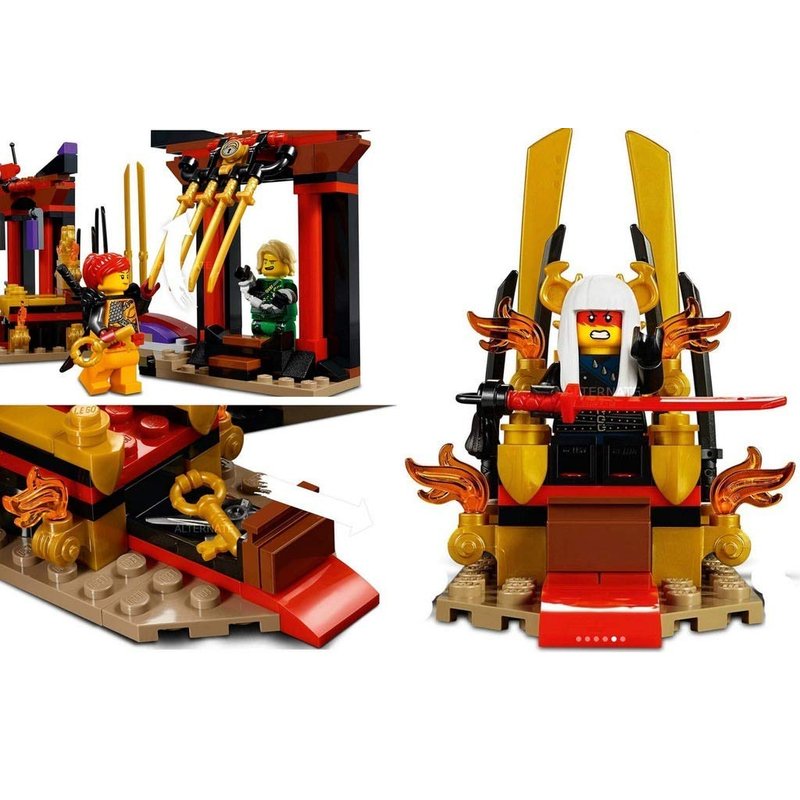 - Build the Palace of Secrets' throne room, featuring a throne with a secret compartments, opening jail and smashing wall function, katanas and blades, then break in with Nya, Skylor and Samurai X